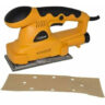 Levigatrice orbitale elettrica 180W. Base di allumino rettangolare 187 x 90mm con sistema di aggancio della carta vetrata con asola. Dotata di sistema di aspirazione con possibilità di agganciare il tubo del aspiratore.