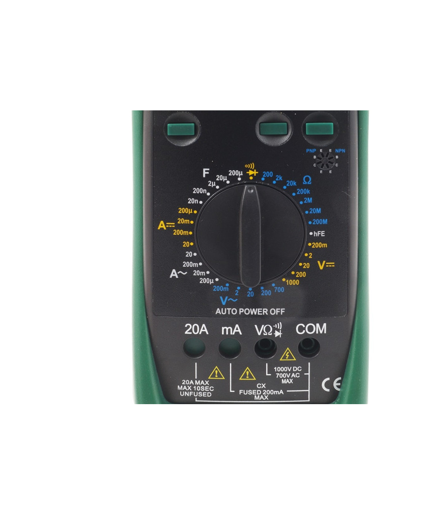 Misura IL VOLTAGGIO DC e AC, corrente AC e DC, resistenza, diodi, transistor, frequenze, temperature, capacità e continuità.