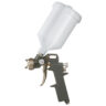 Aerografo a gravità con sistema HVLP (alto volume in bassa pressione) adatto per lavori di carrozzeria o di falegnameria dove è richiesto un alto grado di qualità. E’ munito di ghiera in ottone cromato, ugello ed ago autocompensanti realizzati in acciaio inox e serbatoio in plastica da 500ml. Possiede tre regolazioni separate per la pressione dell’aria in ingresso, per la quantità di vernice e per l’apertura del ventaglio. Fornito con chiavi di manutenzione, scovolino attacco a vite da 1/4″, attacco per tubo da 8mm e spazzolino.