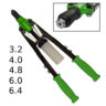 Rivettatrice ideale per professionisti ma anche per chi ama il fai da te o semplicemente da avere nella propria cassetta attrezzi per un utensile pronto all’uso nel momento opportuno. E’ dotata di impugnatura morbida e ugelli per rivetti da 3.2 | 4.0 | 4.8 | 6.0 | 6.4mm. Dimensioni della rivettatrice: circa 450mm.