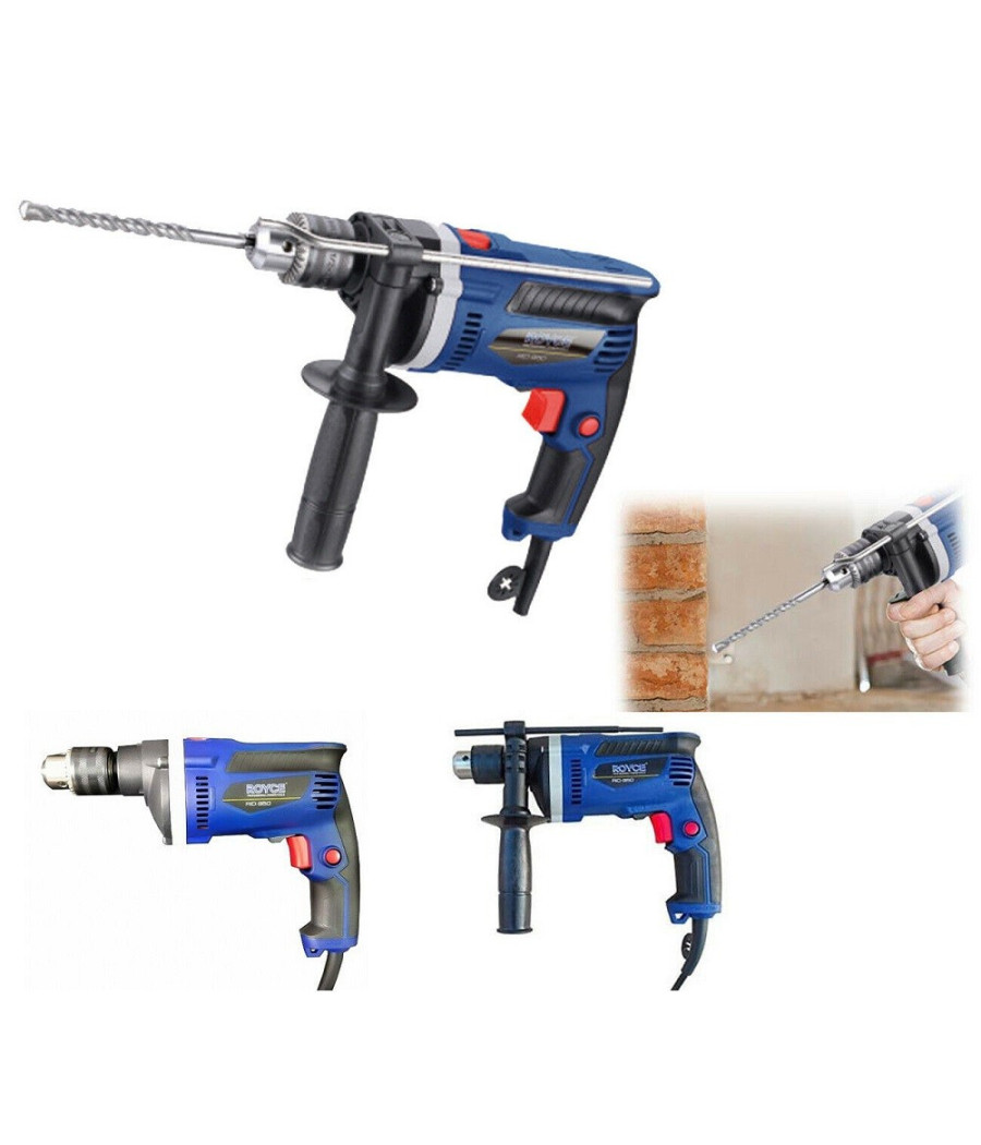 Trapano elettrico dalla potenza di 950W per eseguire ogni tipo di lavoro con il massimo della precisione e semplicità, dovuta anche al classico mandrino da 13mm. Questo trapano è perfetto per quei lavori di foratura di diversi materiali (legno, metallo, cemento) che richiedono precisione e professionalità. Dotato di tasto di blocco, impugnatura ausiliare con protezione anti rotazione. Potrete impostare il verso di rotazione sia orario che antiorario della punta, e utilizzarlo anche in taluni casi come avvitatore/svitatore. Alimentazione a corrente di rete da 220V (classica corrente di casa).